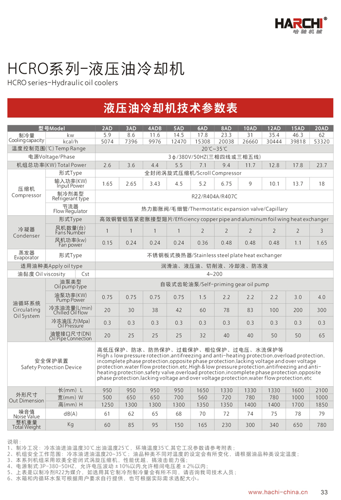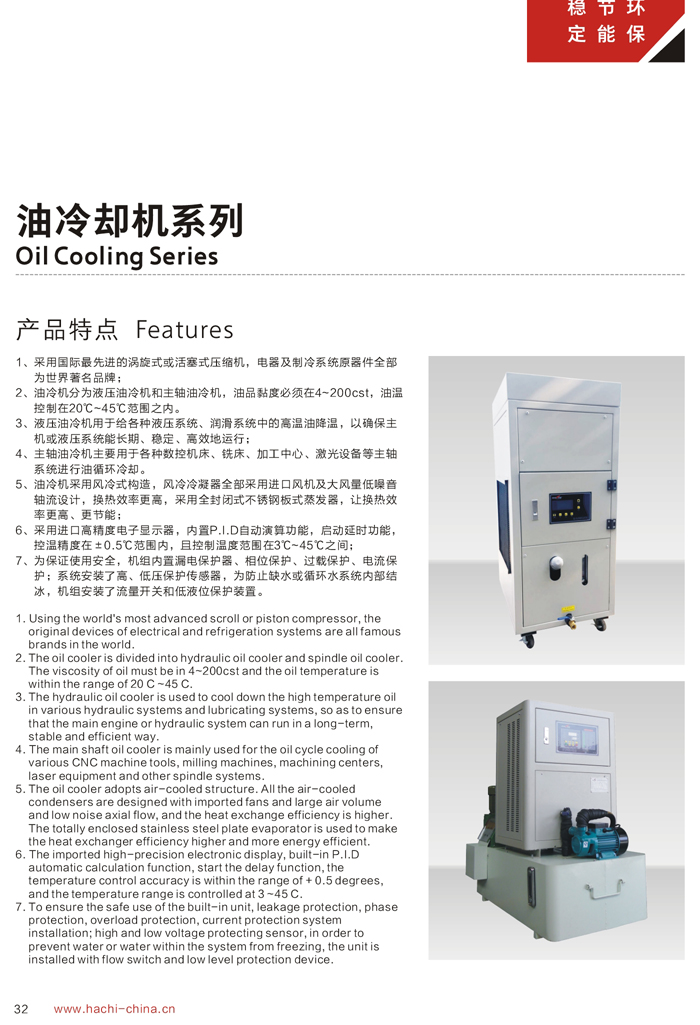 1、制冷能力是在環(huán)境溫度35℃,進(jìn)油溫度35℃,出油溫度30℃,油品為ISO VG32條件下測得。 2、用戶在選擇油冷機(jī)時,必須選擇油液需控制的溫度范圍(1)18℃-25℃ (2)25℃-35℃ (3)35℃-45℃ (4)45℃以上。本公司推薦液壓油合理的溫度控制范圍為35℃-45℃. 3、油冷機(jī)吸油口必須用硬管連接,且加裝過濾器。 4、吸油管長度不應(yīng)超過1.5米,如超出必須加粗吸油口。 5、油冷機(jī)吸油口應(yīng)靠近設(shè)備回油口,出油口應(yīng)靠近設(shè)備供油口。 6、如吸油口太長,需將油泵與機(jī)組分離。 7、以上機(jī)組使用環(huán)境為5~42℃,42℃以上屬高溫機(jī)組,外形尺寸及相關(guān)參數(shù)會有所變更,請選型時注意。 8、參數(shù)表內(nèi)為本公司標(biāo)準(zhǔn)機(jī)型,本公司接受客戶特殊訂貨。 適用種類: ◇ CNC車床、銑床、磨床、拉床 ◇ CNC旋轉(zhuǎn)臺、油壓機(jī)、木工雕刻機(jī) ◇ CNC立式/臥式加工中心、綜合切削加工中心 ◇ 高速機(jī)械主軸、電主軸、靜壓(動靜壓)主軸 ◇ 各種機(jī)械的液壓站及潤滑系統(tǒng) ◇ 放電加工設(shè)備.